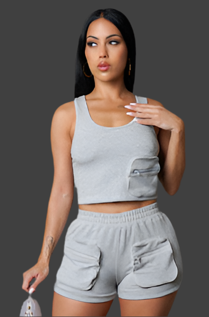 Grey short set with pocket compartment attached on both top and shorts. Very comfy, very cozy!! ✨✨✨✨✨✨✨✨✨